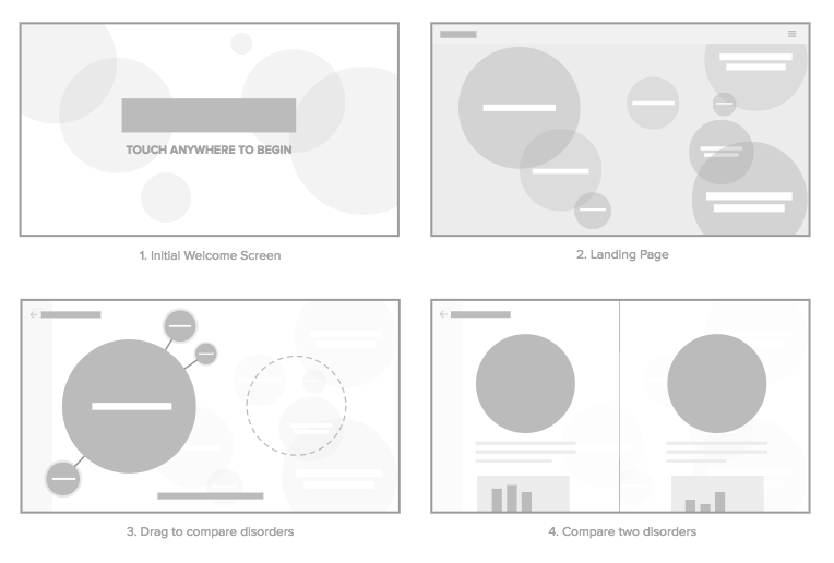 The output of this project is an interactive display; users can navigate through the application using touch gestures. The target demographic is college students, so the display is designed to be placed in heavily-tracked areas on college campuses. It will function primarily as a learning tool, but also as a way to bring people together and foster conversation about mental illness. Students can see others using the installation, and may get curious and want to try it out for themselves.